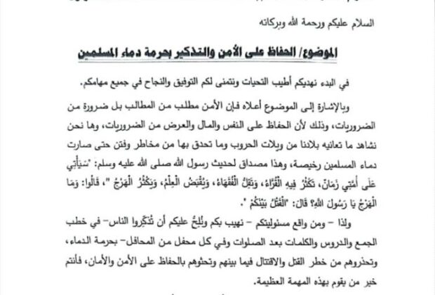أصدر مكتب الأوقاف والإرشاد بالعاصمة المؤقتة عدن، تعميماً هاماً إلى مدراء أوقاف المديريات وأئمة وخطباء المساجد، يدعوهم فيه إلى تكثيف الجهود الدعوية للحفاظ على الأمن والاستقرار. وشدد التعميم على ضرورة تذكير المواطنين بـ “حرمة دماء المسلمين” وصون الأنفس والأموال والأعراض، معتبراً