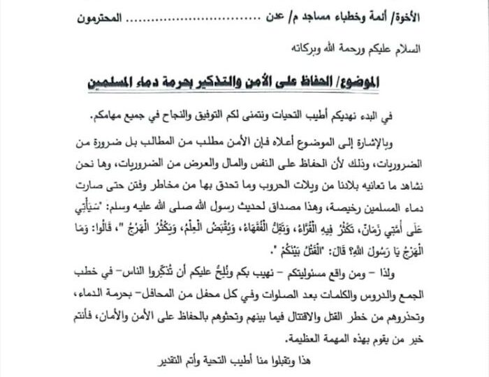 أصدر مكتب الأوقاف والإرشاد بالعاصمة المؤقتة عدن، تعميماً هاماً إلى مدراء أوقاف المديريات وأئمة وخطباء المساجد، يدعوهم فيه إلى تكثيف الجهود الدعوية للحفاظ على الأمن والاستقرار. وشدد التعميم على ضرورة تذكير المواطنين بـ “حرمة دماء المسلمين” وصون الأنفس والأموال والأعراض، معتبراً