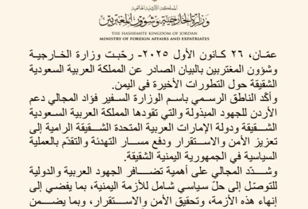 رحّبت وزارة الخارجية وشؤون المغتربين بالبيان الصادر عن المملكة العربية السعودية الشقيقة حول التطورات الأخيرة في اليمن. وأكّد الناطق الرسمي باسم الوزارة السفير فؤاد المجالي دعم الأردن للجهود المبذولة والتي تقودها المملكة العربية السعودية الشقيقة ودولة الإمارات العربية المتحدة الشقيقة الرامية