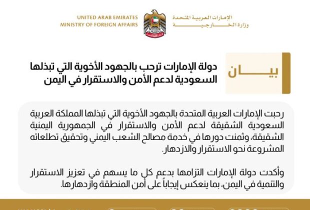 أعربت دولة الإمارات العربية المتحدة عن ترحيبها بالجهود الأخوية والدؤوبة التي تبذلها المملكة العربية السعودية الشقيقة لدعم الأمن والاستقرار في الجمهورية اليمنية . وأصدرت وزارة الخارجية الإماراتية بياناً أكدت فيه تثمين الدولة للدور السعودي المحوري في خدمة مصالح الشعب اليمني، ودعم