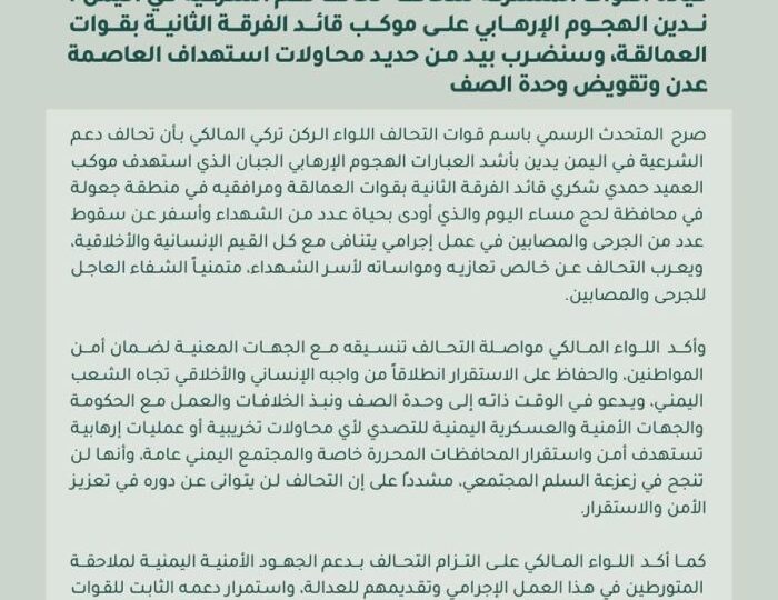 أدانت قيادة القوات المشتركة لـ “تحالف دعم الشرعية في اليمن”، بأشد العبارات، الهجوم الإرهابي الجبان الذي استهدف مساء اليوم موكب العميد حمدي شكري، قائد الفرقة الثانية بقوات العمالقة، ومرافقيه في منطقة “جعولة” بمحافظة لحج، والذي أسفر عن سقوط عدد من الشهداء