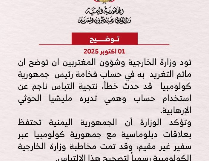 أصدرت وزارة الخارجية وشؤون المغتربين اليمنية اليوم توضيحاً رسمياً بشأن تغريدة نُشرت في حسابها وتعلقت بفخامة رئيس جمهورية كولومبيا. وأشارت الوزارة في بيانها إلى أن ما تم التغريد به قد “حدث خطأً، نتيجة التباس ناجم عن استخدام حساب وهمي تديره