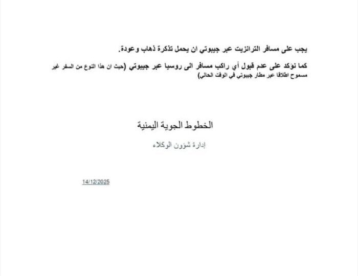 أصدرت الخطوط الجوية اليمنية (Yemen Airways) تعميماً هاماً موجهاً لجميع المسافرين والوكلاء، يتضمن شروطاً جديدة ومشددة بخصوص الترانزيت (العبور) عبر مطار جيبوتي. وجاء في التنويه، اشتراط تذكرة ذهاب وعودة حيث نص، يجب على أي مسافر ترانزيت عبر جيبوتي أن يحمل تذكرة