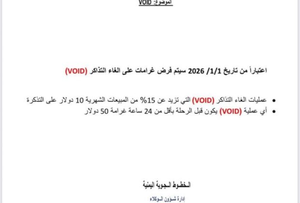 أعلنت الخطوط الجوية اليمنية (Yemenia Airways) عن تحديثات جديدة في سياسة إلغاء التذاكر (VOID)، تضمنت فرض غرامات مالية على الوكلاء، وذلك لضمان تنظيم عمليات البيع والحد من الإلغاءات العشوائية. ووفقاً للتعميم الصادر برقم (14) لعام 2025، الموجه إلى وكلاء السفر المعتمدين،
