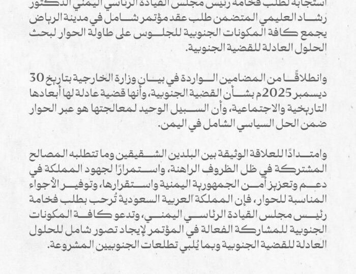 أعلنت وزارة الخارجية السعودية، عن ترحيب المملكة العربية السعودية بطلب رئيس مجلس القيادة الرئاسي اليمني، الدكتور رشاد العليمي، لعقد مؤتمر شامل في مدينة الرياض يجمع كافة المكونات الجنوبية على طاولة الحوار. وتأتي هذه الخطوة استجابةً رسمية لطلب القيادة اليمنية، وتهدف إلى