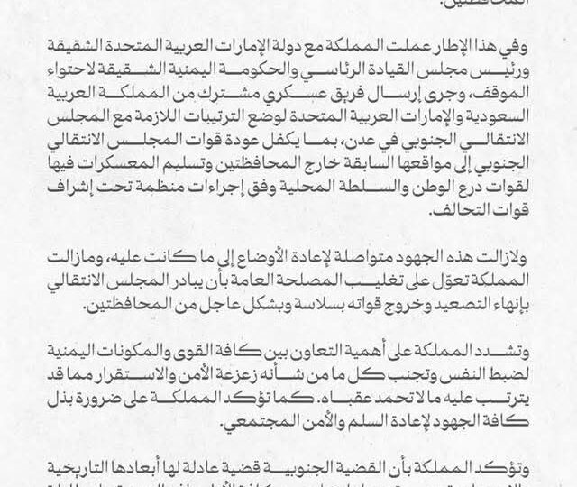 أصدرت وزارة الخارجية في المملكة العربية السعودية بياناً رسمياً أكدت فيه أن التحركات العسكرية الأخيرة التي قام بها المجلس الانتقالي الجنوبي في محافظتي حضرموت والمهرة قد تمت بشكل أحادي. وأوضح البيان أن هذه التحركات افتقرت إلى موافقة مجلس القيادة الرئاسي أو