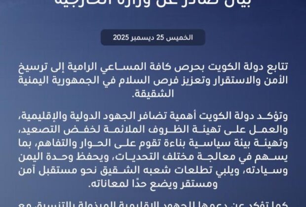 أصدرت وزارة الخارجية في دولة الكويت بياناً رسمياً، أكدت فيه متابعتها الحثيثة واهتمامها البالغ بكافة المساعي الرامية إلى ترسيخ دعائم الأمن والاستقرار وتعزيز فرص السلام في الجمهورية اليمنية. وشددت دولة الكويت في بيانها على الأهمية القصوى لتضافر الجهود الدولية والإقليمية في