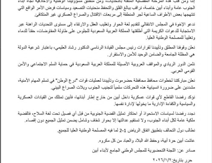 أصدرت اللجنة التحضيرية للمجلس الوطني الجامع لأبناء أبين، بياناً هاماً استعرضت فيه موقفها من المستجدات السياسية والعسكرية على الساحة اليمنية، وتحديداً ما يخص محافظة أبين والمحافظات الجنوبية. وأعلن المجلس وقوفه المطلق وتأييده لقرارات رئيس مجلس القيادة الرئاسي، الدكتور رشاد العليمي، مؤكداً
