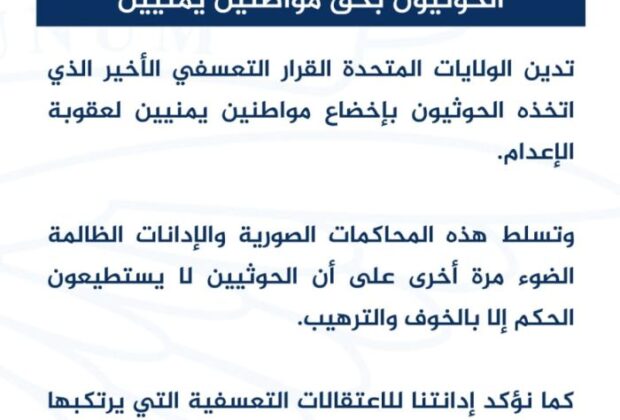 أدانت الولايات المتحدة الأمريكية القرارات التي أصدرتها مليشيات الحوثيين باعدام 17 يمنيا. وقالت السفارة الأمريكية في اليمن ببيان لها ان “الولايات المتحدة تدين القرار التعسفي الاخير الذي اتخذه الحوثيون بإخضاع مواطنين يمنيين لعقوبة الاعدام”. واكد البيان “تسلط هذه المحاكمات الصورية والادانات
