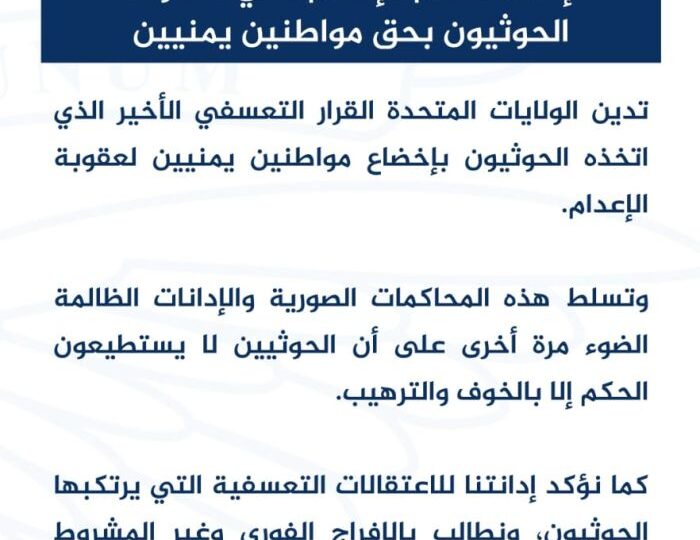 أدانت الولايات المتحدة الأمريكية القرارات التي أصدرتها مليشيات الحوثيين باعدام 17 يمنيا. وقالت السفارة الأمريكية في اليمن ببيان لها ان “الولايات المتحدة تدين القرار التعسفي الاخير الذي اتخذه الحوثيون بإخضاع مواطنين يمنيين لعقوبة الاعدام”. واكد البيان “تسلط هذه المحاكمات الصورية والادانات