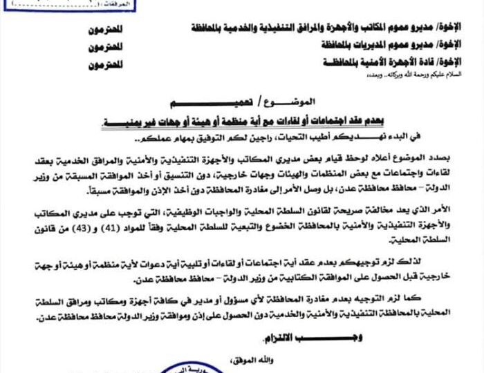 أصدر وزير الدولة، محافظ محافظة عدن، تعميماً رسمياً يقضي بمنع مديري المكاتب التنفيذية والأجهزة الأمنية والخدمية ومديري المديريات من عقد أي لقاءات أو اجتماعات مع منظمات أو هيئات أو جهات خارجية إلا بموافقة كتابية مسبقة. وجاء في التعميم أن هذا الإجراء