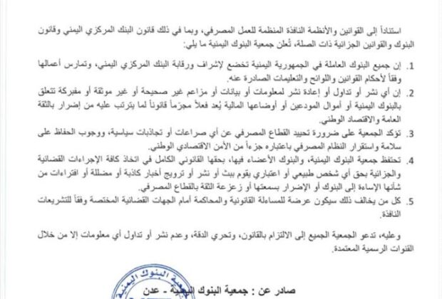 حذرت جمعية البنوك اليمنية بمدينة عدن من تداول أو نشر أي معلومات مضللة أو بيانات غير موثقة تتعلق بأوضاع البنوك أو أموال المودعين، مؤكدة أن مثل هذه الأفعال تُعد “جرائم قانونية” تضر بالثقة العامة والأمن الاقتصادي الوطني. وفي بيان رسمي أصدرته