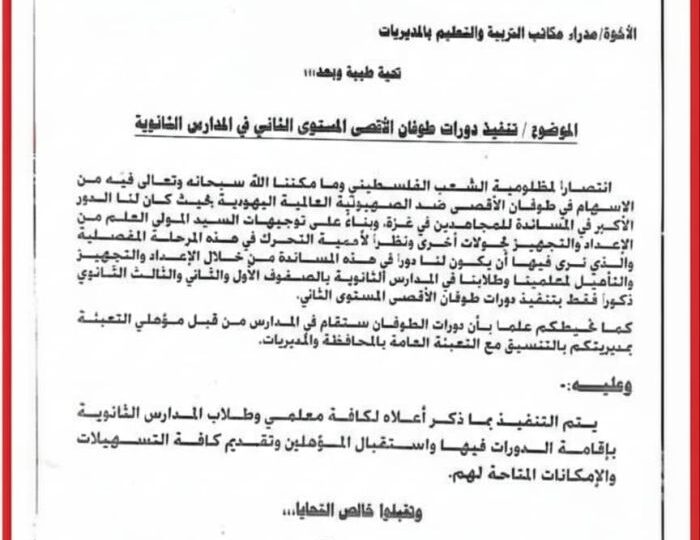 كشفت وثيقة رسمية حصل موقع قناة اليمن اليوم على نسخة منها، صادرة عن مكتب التربية والتعليم التابع لجماعة الحوثي في صنعاء عن توجيهات ببدء تنفيذ ما يسمى دورات “طوفان الأقصى – المستوى الثاني” لطلاب ومعلمي المدارس الثانوية في خطوة تصعيدية جديدة
