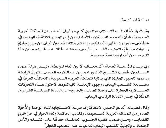 رابطة العالم الإسلامي تدعو المجلس الانتقالي لسرعة الاستجابة لنداء الوحدة الصادر عن السعودية