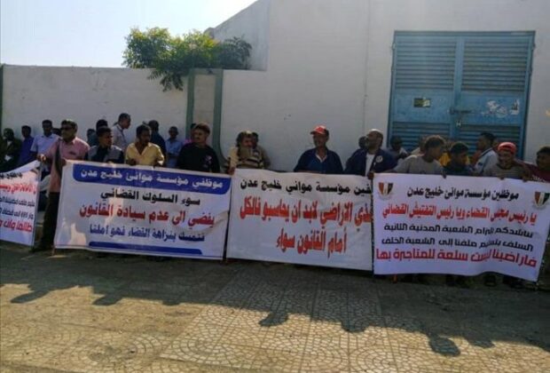 نفّذ عمال وموظفو ميناء عدن ومؤسسة موانئ خليج عدن، صباح اليوم الثلاثاء، وقفة احتجاجية أمام محكمة الاستئناف بعدن في مديرية صيرة، للمطالبة بإنصافهم القانوني في قضيتهم المتعلقة بالأراضي التعويضية الممنوحة لهم في وحدة جوار (695)، ورفض ما وصفوه بالتلاعب بمحاضر الجلسات