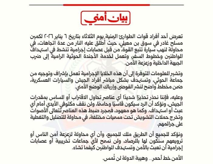 أصدرت قيادة قوات الطوارئ اليمنية (الفرقة الأولى)، بيانًا أمنيًا عاجلاً، كشفت فيه عن تعرض أحد أفرادها لكمين غادر نفذته عصابة مسلحة يوم الثلاثاء الماضي، الموافق 6 يناير 2026، في منطقة “سوق بن معيلي”. وفقًا للبيان، فقد تعرض الجندي لإطلاق نار كثيف