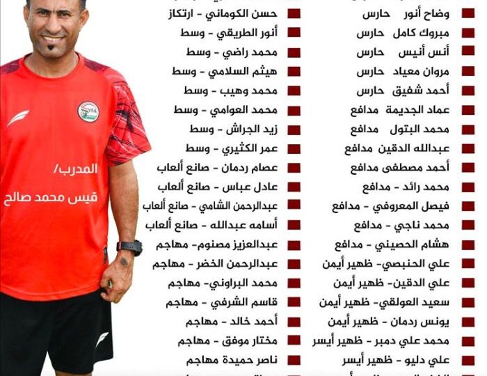 استدعى الكابتن قيس محمد صالح، مدرب المنتخب الأولمبي لكرة القدم تحت سن 23 عاما، قائمة تضم 44 لاعبًا للالتحاق بالمعسكر الداخلي المقرر انطلاقه بعد غد الأحد في صنعاء، تحت إشراف الاتحاد العام لكرة القدم. يأتي ذلك استعدادا للمشاركة في بطولة كأس
