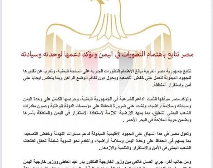 أصدرت وزارة الخارجية المصرية بياناً صحفياً أكدت فيه متابعة جمهورية مصر العربية ببالغ الاهتمام للتطورات الجارية على الساحة اليمنية، مشددة على موقفها الثابت والداعم لوحدة اليمن، سيادته، وسلامة أراضيه. وأعربت مصر في بيانها عن تقديرها لكافة الجهود المبذولة لخفض التصعيد والحيلولة