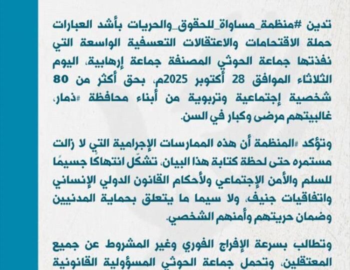 أشارت منظمة “مساواة” للحقوق والحريات أنها وثقت قيام جماعة الحوثي المصنّفة إرهابية بـ “اعتقال” أكثر من 80 شخصية اجتماعية وتربوية خلال حملة اقتحامات في محافظة ذمار (وسط اليمن) اليوم الثلاثاء 28 أكتوبر/تشرين الأول. وندّدت المنظمة في بيان صحفي بحملة الاقتحامات والاعتقالات،