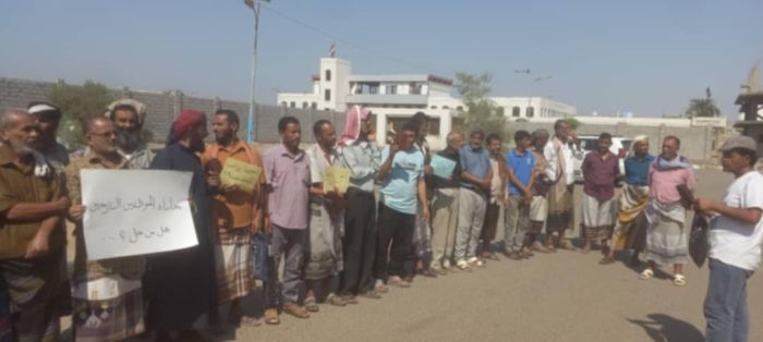موظفون نازحون من البيضاء يحتجون في عدن للمطالبة بمرتباتهم المتوقفة