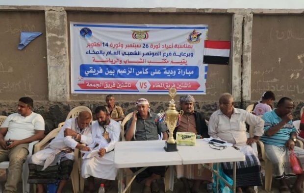 تُوِّج فريق ناشئي الجمعة بكأس “الزعيم” لكرة القدم، عقب فوزه على نظيره ناشئي المخا بهدف دون رد، في المباراة التي احتضنها ملعب نادي الميناء بمدينة المخا غرب محافظة تعز، ضمن الفعاليات الرياضية الاحتفالية بأعياد الثورة اليمنية. وأقيمت المباراة بمناسبة الذكرى الـ