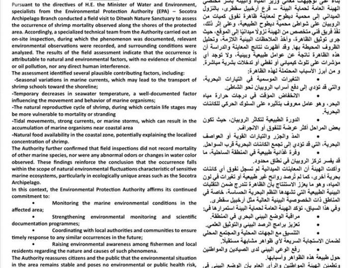 أعلنت الهيئة العامة لحماية البيئة في أرخبيل سقطرى، التابعة لوزارة المياه والبيئة، عن نتائج تقييمها الميداني لظاهرة نفوق وتكدس كميات كبيرة من الروبيان في محمية “ديطوح” الطبيعية، مؤكدة أن الظاهرة تعود لأسباب طبيعية وبيئية ولا تدعو للقلق. وأوضح البيان الصادر عن