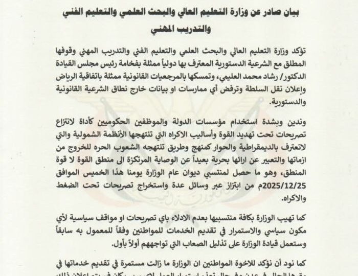 أكدت وزارة التعليم العالي والبحث العلمي والتعليم الفني والتدريب المهني، اليوم الخميس، موقفها الثابت والداعم للشرعية الدستورية المعترف بها دولياً. وشددت الوزارة في بيانها على تمسكها الكامل بالمرجعيات القانونية، وفي مقدمتها اتفاقية الرياض وإعلان نقل السلطة، معلنةً رفضها القاطع لأي ممارسات