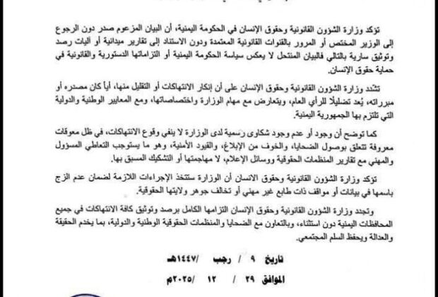 أصدرت وزارة الشؤون القانونية وحقوق الإنسان في الحكومة اليمنية، اليوم الاثنين 29 ديسمبر 2025، بياناً رسمياً استنكرت فيه بشدة صدور بيان “مزور ومفبرك” نُسب إليها، تضمن مزاعم مضللة تنفي وجود أي انتهاكات لحقوق الإنسان في محافظتي حضرموت والمهرة. وأكدت الوزارة في
