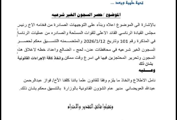 أصدر وزير العدل، القاضي بدر عبده أحمد العارضة، توجيهاً هاماً إلى النائب العام، القاضي قاهر مصطفى، يقضي بالبدء الفوري في حصر وإغلاق كافة السجون غير القانونية (غير الشرعية) في محافظات (عدن، لحج، والضالع). وجاء هذا التوجيه استناداً إلى تعليمات رئيس مجلس