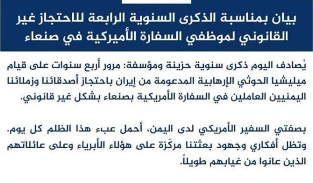 أصدرت السفارة الأمريكية بيانًا رسميًا بمناسبة مرور أربع سنوات على احتجاز جماعة الحوثي المدعومة من إيران لعدد من موظفي السفارة الأمريكية في صنعاء، واصفة الحادثة بأنها «عمل غير قانوني ومخزٍ» يستهدف أبرياء خدموا في إطار إنساني ومهني بحت. وأكد السفير الأمريكي