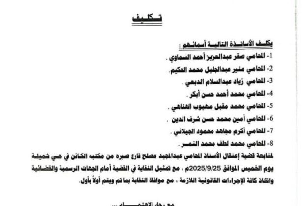 أصدرت نقابة المحامين اليمنيين اليوم الإثنين 20 أكتوبر 2025م ، تكليفا رسميا لعدد من المحامين لمتابعة قضية اختطاف المحامي عبدالمجيد مصلح فارع صبره، الذي تم اختطاف أثناء مزاولته عمله في مكتبه الكائن في حي شميلة بالعاصمة صنعاء يوم الخميس الموافق