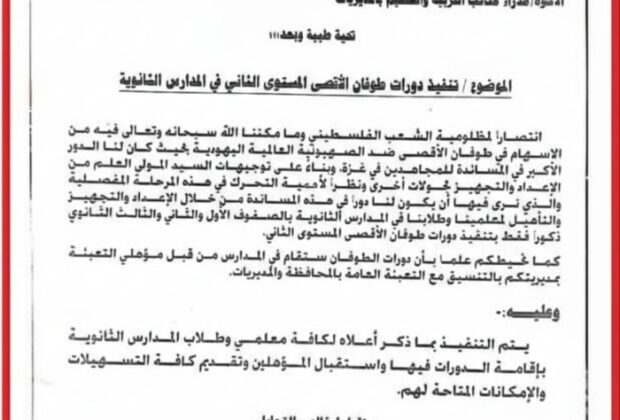 كشفت وثيقة رسمية حصل موقع قناة اليمن اليوم على نسخة منها، صادرة عن مكتب التربية والتعليم التابع لجماعة الحوثي في صنعاء عن توجيهات ببدء تنفيذ ما يسمى دورات “طوفان الأقصى – المستوى الثاني” لطلاب ومعلمي المدارس الثانوية في خطوة تصعيدية جديدة