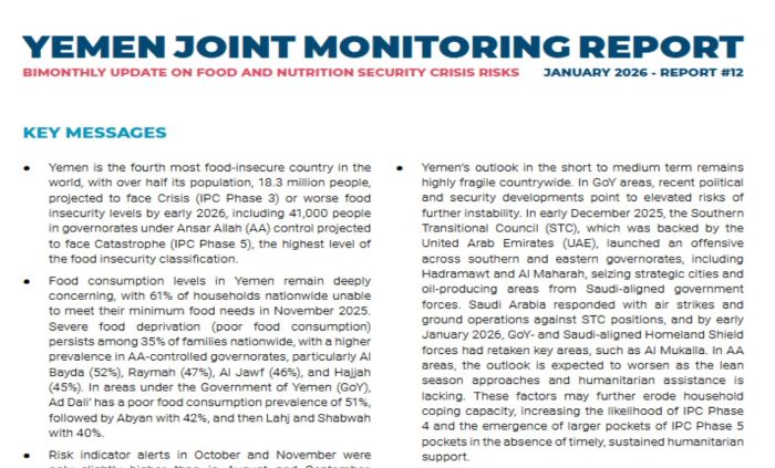 A recent report published jointly by the World Bank and five United Nations organizations, found that Food consumption levels in Yemen remain deeply concerning, with 61% of households nationwide unable to meet their minimum food needs in November 2025. The report