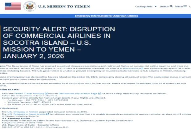 The U.S. Mission to Yemen announced that the Department of State has received reports of closures, cancelations and redirected flights on commercial airline travel to and from the island of Socotra (Yemen) to nearby airports. The Department of State U.S. advised